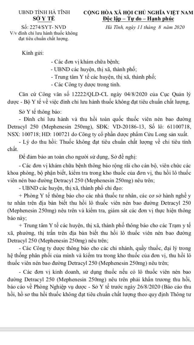 Căn cứ Công văn số 12222/QLD-CL ngày 04/8/2020 của Cục Quản lý dược - Bộ Y tế về việc đình chỉ lưu hành thuốc không đạt tiêu chuẩn chất lượng, Sở Y tế thông báo: - Đình chỉ lưu hành và thu hồi toàn quốc thuốc viên nén bao đường Detracyl 250 (Mephenesin 250mg), SĐK: VD-20186-13, Số lô: 61100718, NSX: 100718; HD: 100721 do Công ty cổ phần dược phẩm Cửu Long sản xuất. - Lý do thu hồi: Thuốc không đạt tiêu chuẩn chất lượng về chỉ tiêu tính chất.